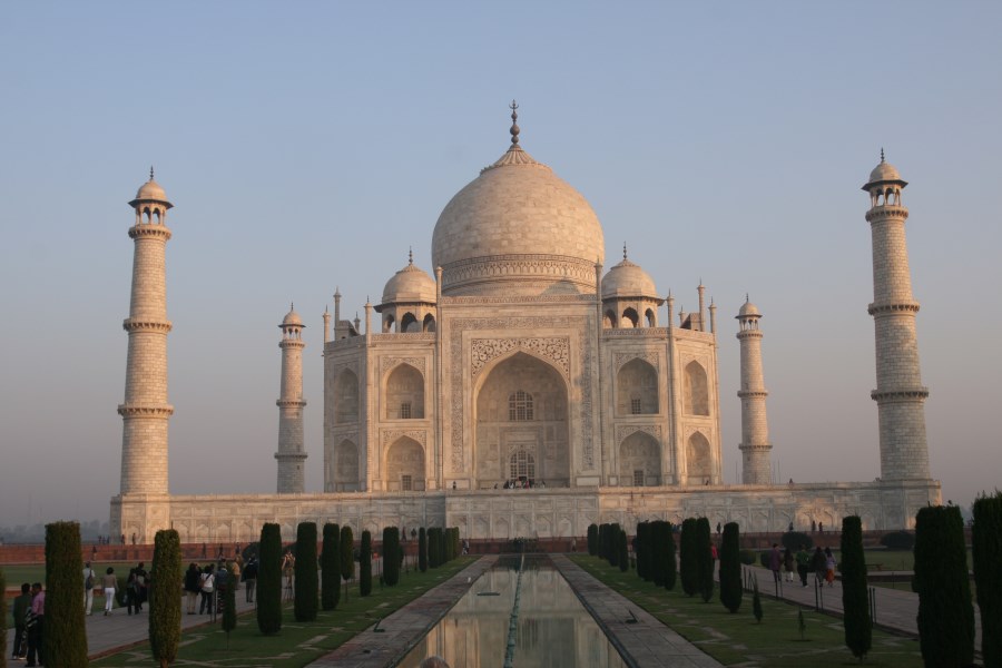 Le Taj Mahal semble sortir de la brume, comme un enchantement, sculpté dans du marbre blanc, symétrie parfaite, marbre incrusté de pierres précieuses pour créer des fleurs, des lettres, magique !